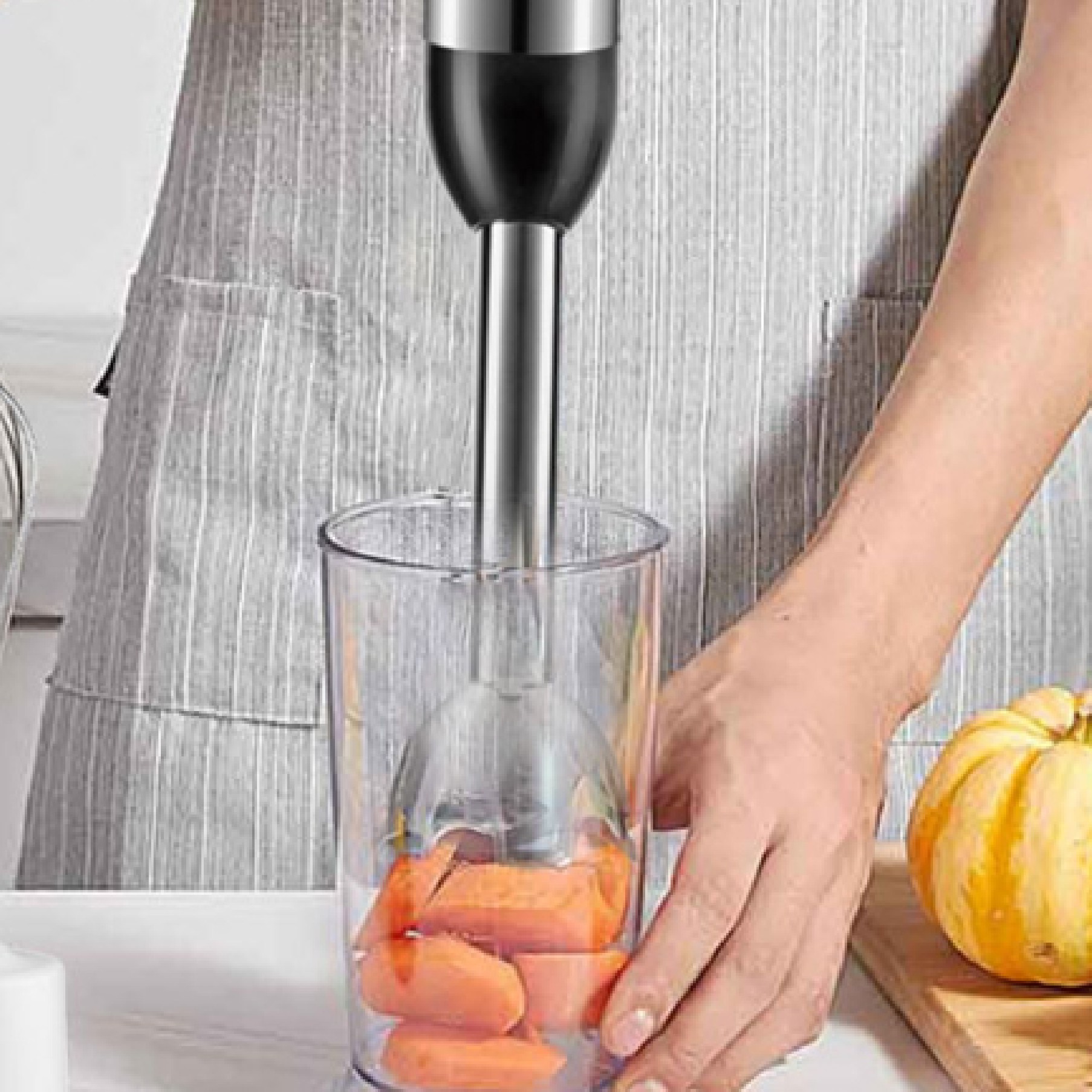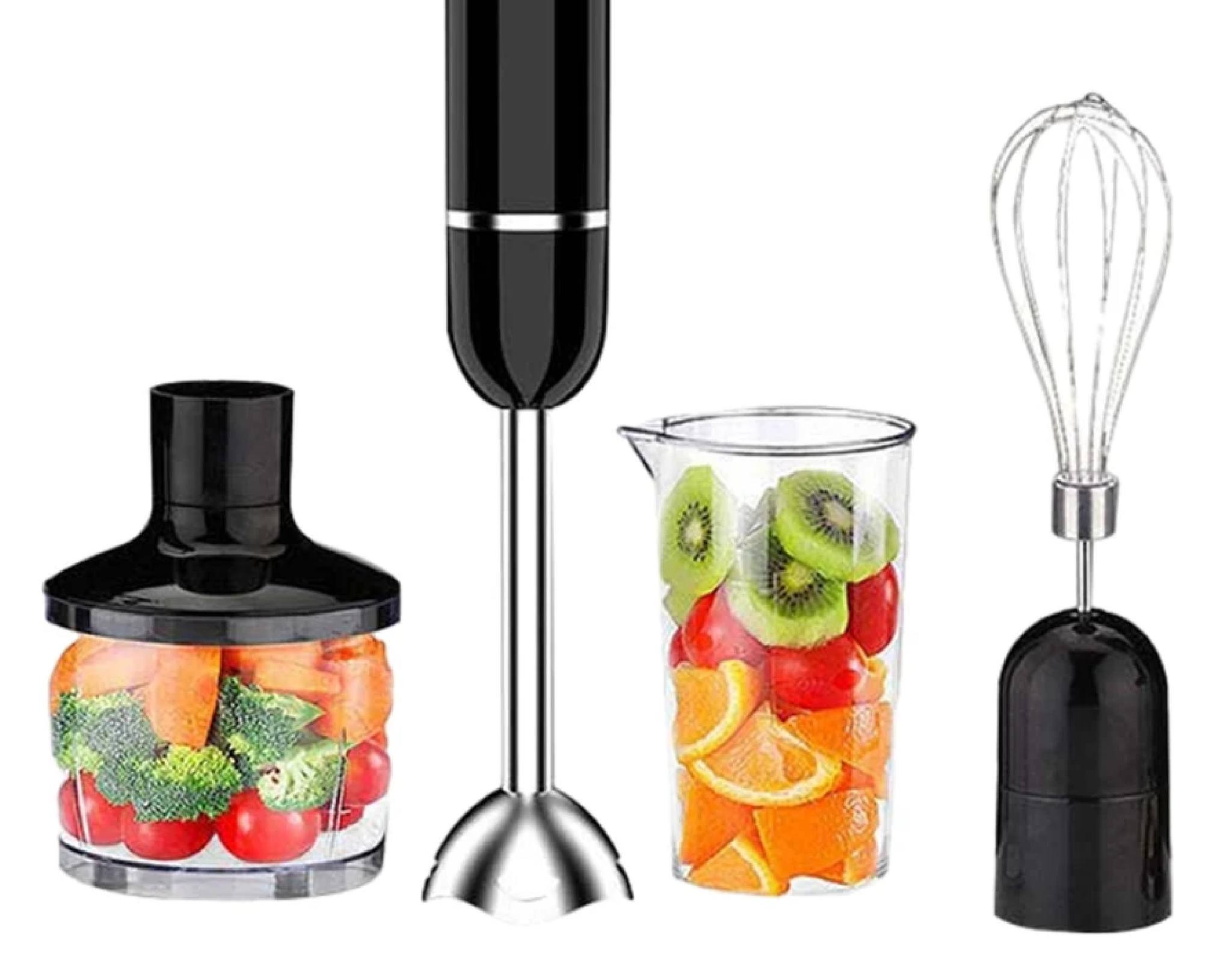 Tiene un brazo desmontable, dos velocidades y un vaso para preparar jugos directamente con la batidora. También incluye accesorios para batir claras; hacer cremas y un picador-procesador de alimentos.