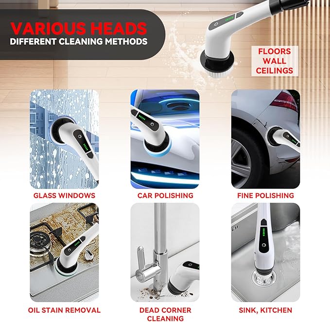 Limpiador eléctrico de alta potencia: este limpiador giratorio eléctrico inalámbrico fue diseñado intencionalmente para un uso versátil en toda tu casa. Cepillo limpiador eléctrico, alimentado por una batería de gran capacidad de 2500 mAh, par grande. Potente potencia de dos velocidades de rotación para tu elección: 300 RPM / 400 RPM. Cuando se usa con un agente de limpieza, puede limpiar rápidamente las manchas difíciles y hacer que el piso de baldosas se vea nuevo. Carga rápida tipo C y pantalla de nivel de batería: gracias a la última tecnología de carga rápida USB-C y la función de visualización de nivel de batería, nunca tendrás que preocuparte por quedarte sin energía. La batería avanzada de 2500 mAh ofrece hasta 90 minutos de limpieza en toda la casa con solo 3 horas de carga. Ajustable de 12 a 54 pulgadas: el mango del cepillo de limpieza de ducha con mango largo tiene un diseño de tres secciones. La longitud se ajusta fácilmente fijando y separando el mango telescópico, y la longitud del depurador eléctrico giratorio se puede ajustar de 12 pulgadas a 54 pulgadas. Es ideal para limpiar áreas de difícil acceso, el limpiador de baño con mango largo libera a las amas de casa de las engorrosas tareas domésticas, no más doblarse y arrodillarse para limpiar, protege tu espalda y rodillas. El cepillo de limpieza eléctrico incluye 7 cepillos de limpieza reemplazables para varios escenarios, puedes elegir diferentes especificaciones de cabezales de cepillo de acuerdo con la situación real. Este limpiador eléctrico de baño es la herramienta ideal para entrar en las grietas de tu baño.